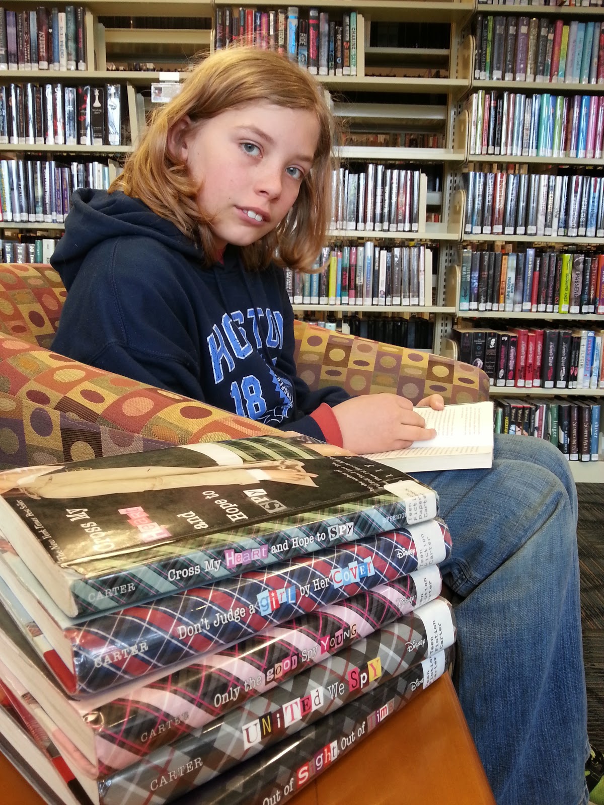 We were at the library today, and Houston was looking for books to read. I pulled the first book of the Gallagher Girl series off the shelf and told him, "You should read this! I really liked these books! They're about a girl who goes to a school for spies!" He rolled his eyes and sighed heavily, said, "FINE," took the book, and walked away.